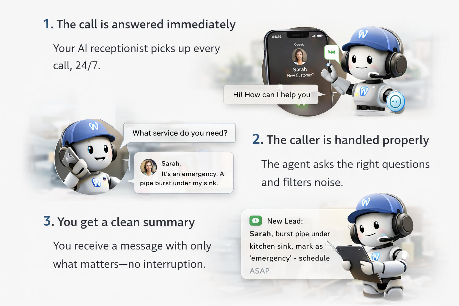 Your AI receptionist picks up every call, 24/7.2. The caller is handled properly.